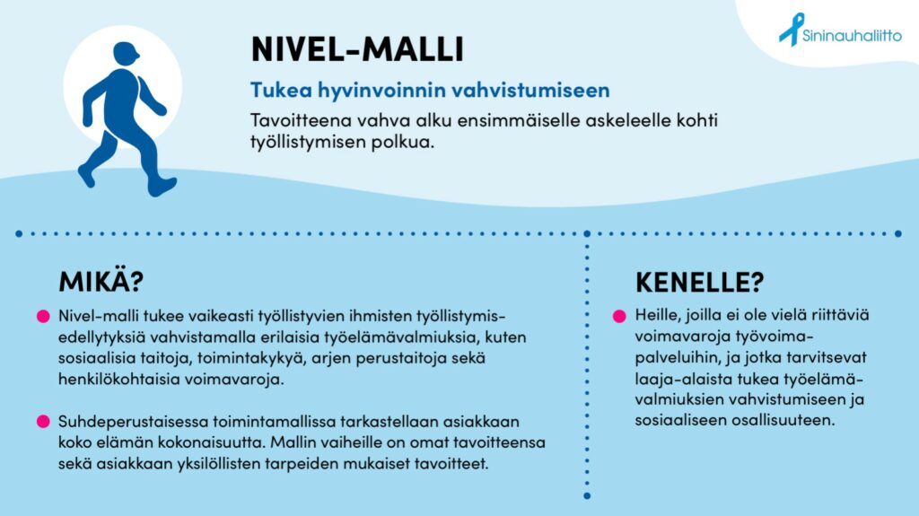 Nivel-malli on Sininauhaliiton ja jäsenjärjestöjen yhdessä kehittämä vaiheittainen toimintamalli vaikeasti työllistyvien asiakkaiden tukemiseen. Malli auttaa jäsentämään asiakkaan polkua ja vahvistamaan niitä valmiuksia, jotka tukevat siirtymistä kohti seuraavia palveluja, koulutusta tai työtä.